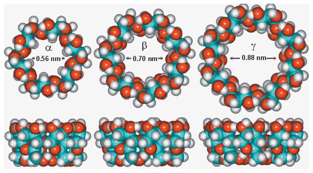 Cyclodextrin and their cavities (α =6, β=7 and γ=8 D-glucopyranoside units).
