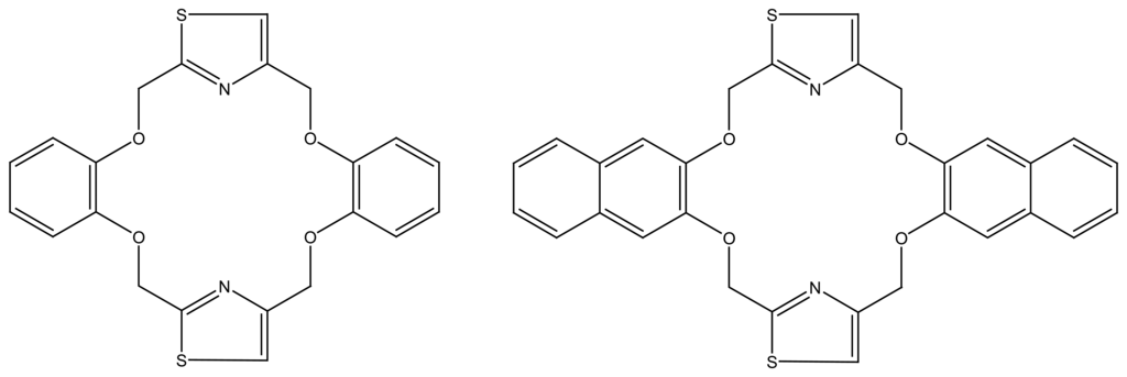 - Kim, H.S.; Do, K.S.; Kim, K.S.; Shim, J.H.; Cha, G.S.; Nam, H. Ammonium ion binding property of naphtho-crown ethers containing thiazole as sub-cyclic unit. Bull. Korean Chem. Soc. 2004, 25, 1465–1470. [Google Scholar]