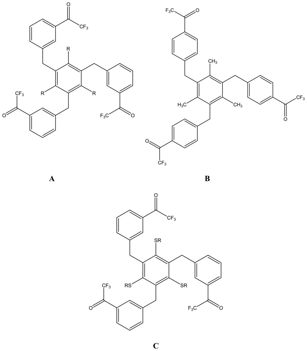 - Kim, Y.K.; Ha, J.; Cha, G.S.; Ahn, K.H. Synthesis of tripodal trifluoroacetophenone derivatives and their evaluation as ion-selective electrode membranes. Bull. Korean Chem. Soc. 2002, 23, 1420–1424. [Google Scholar]