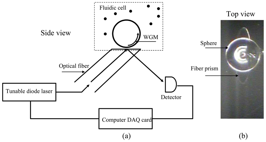 Experimental setup. (a) The sphere is immersed in a fluidic cell and in physical contact with a fiber prism. A tunable diode laser at 980 nm is coupled into the WGM of the sphere via frustrated total internal reflection at the sphere-prism interface. The laser is repeatedly scanned in wavelength and controlled by a computer DAQ card. (b) Image of a fiber prism with a fused silica microsphere.