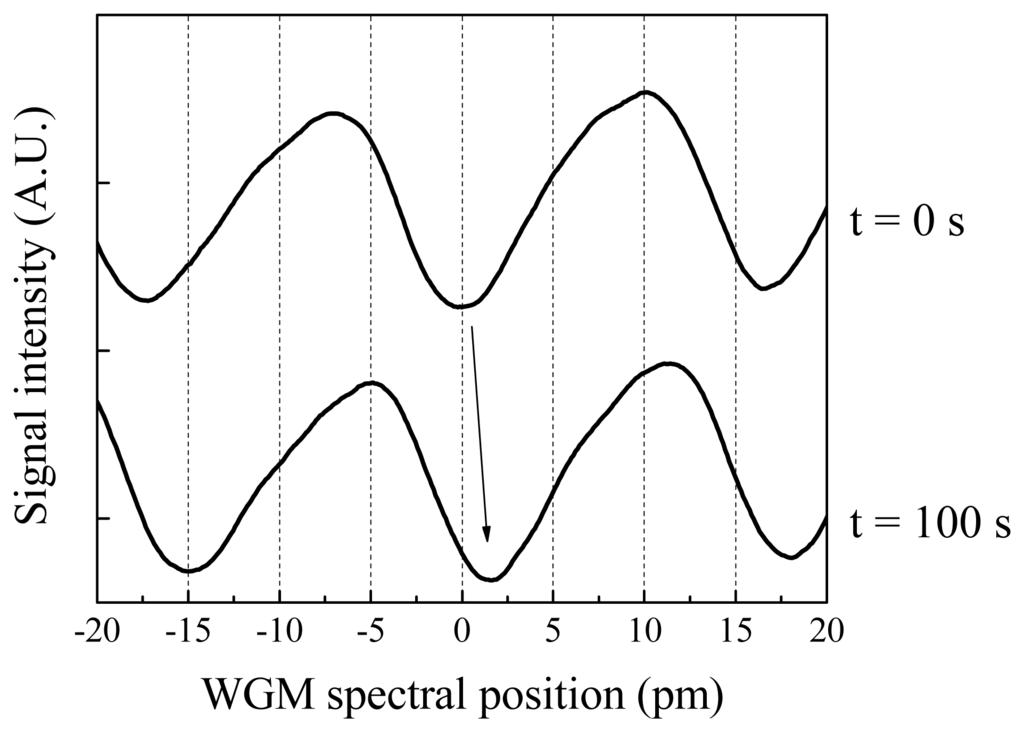 WGM spectral position shifts as bio/chemical molecules attach to the surface over time. The lines are shifted vertically for clarity.
