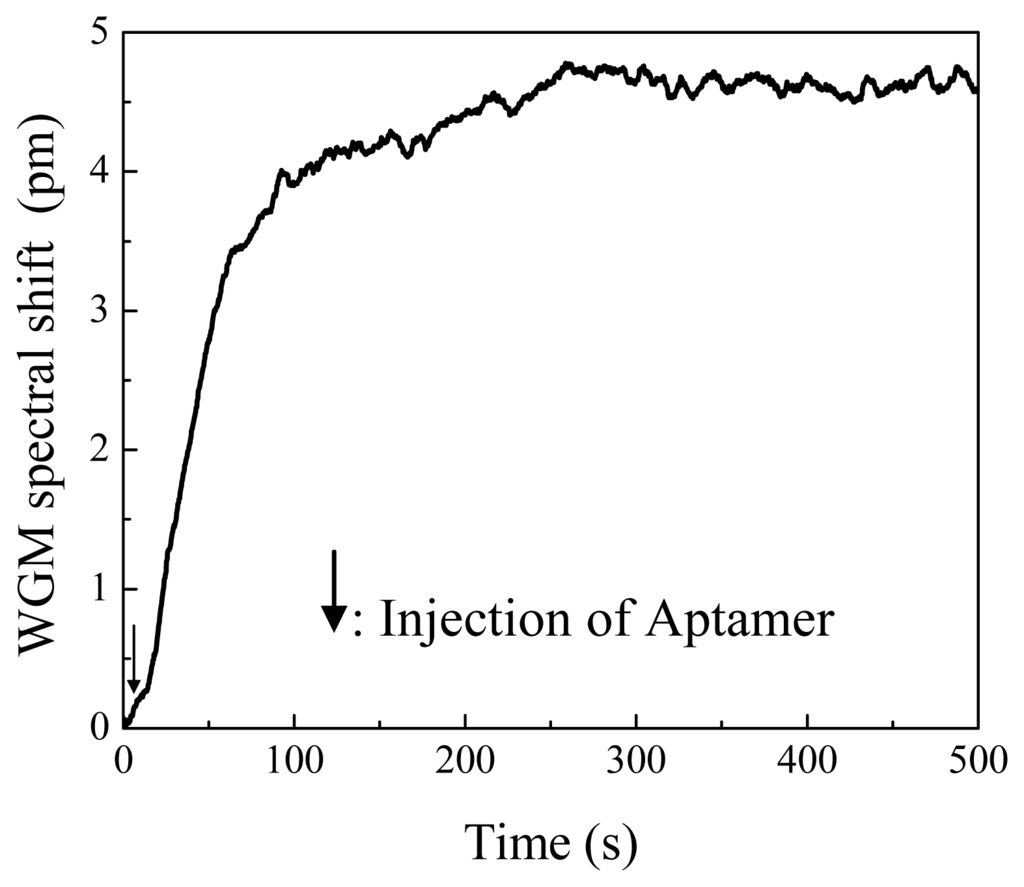 The microsphere sensor design enables the aptamer deposition to be monitored. After PDC deposition, the sphere is immersed in the fluidic cell filled with carbonate buffer (pH = 8.3). The sensor baseline is established when the sphere and water reach thermal equilibrium. 2 mM aptamer is injected to the carbonate buffer and reached the final concentration of 0.5 mM. As shown in Fig. 3, the WGM spectral position shifts to the longer wavelength by 4.1 pm in response to the binding of aptamers to the functionalized sphere surface, which reaches saturation within 5 minutes. Therefore, in our experiment, 1 hour incubation in 2 mM aptamer solution is sufficient for aptamer immobilization. The surface density σ of the aptamer can be calculated using the following expression [18]: