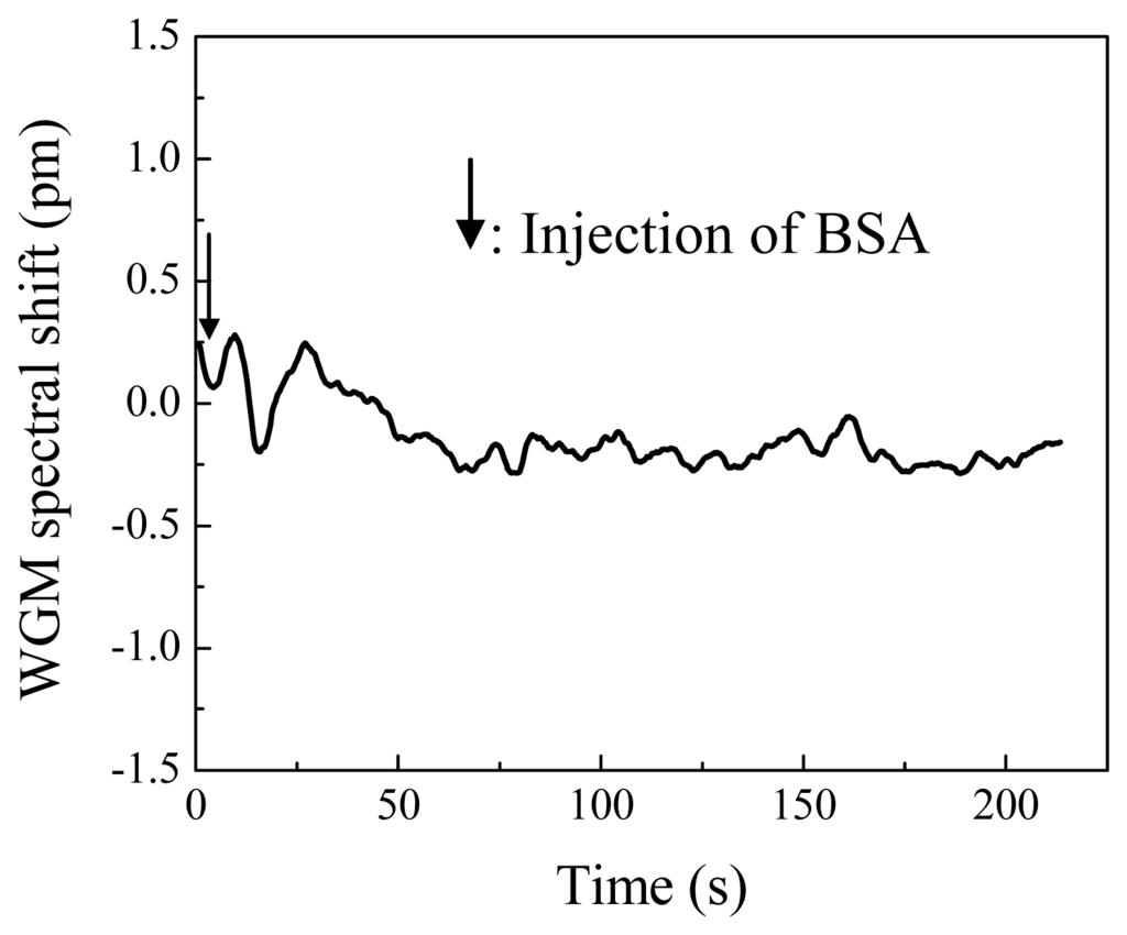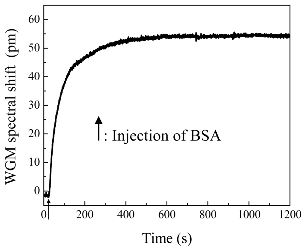 Sensorgram of BSA binding to the PDC cross-linker on the silanized microsphere surface. The total WGM shift is 54 pm, corresponding to a BSA surface density of 3.4×1012/cm2. Arrow indicates when BSA solution is added. BSA concentration is 0.8 mg/mL. Sphere size: R = 100 μm.