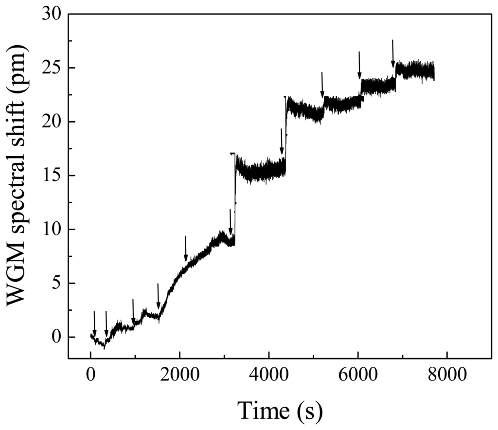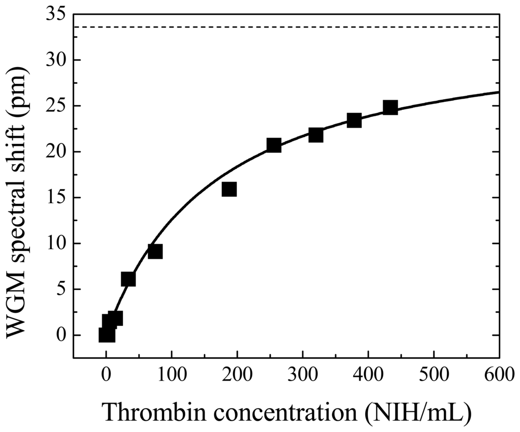 The primary experiment in this work demonstrates that a microsphere treated with anti-thrombin aptamers is capable of specifically capturing thrombin molecules. Thrombin is first dissolved in DI water (pH ∼ 7) and stored in a plastic vial, as it typically adsorbs to silica surfaces. The aptamer-modified sphere is immersed in DI water and different concentrations of thrombin are injected to the fluidics cell gradually. Upon each injection, the WGM shifts to a higher wavelength, as shown in the sensorgram in Fig. 6, indicating a binding between thrombin and aptamers on the sphere surface. The WGM spectral response as a function of the thrombin concentration is plotted in Fig. 7.