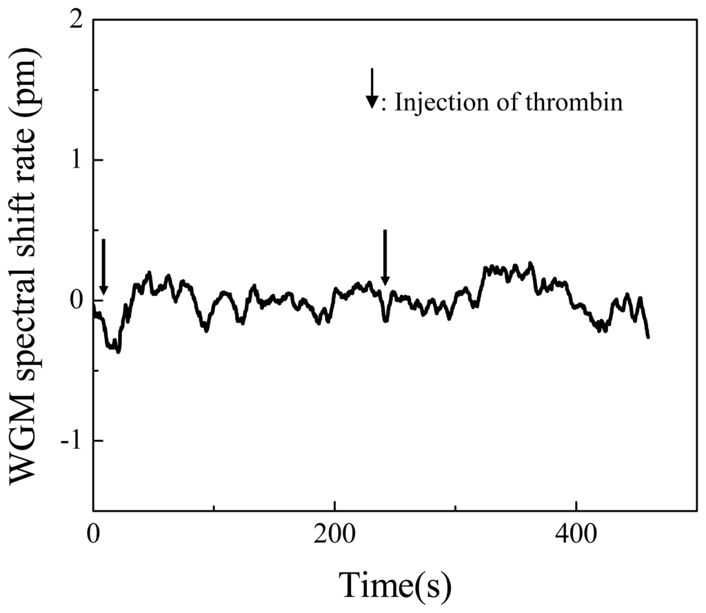 Control experiment shows that thrombin does not bind to the sphere surface immobilized with non-aptamer oligonucleotides. Arrows indicate when thrombin solution is added to reach a concentration of 7 NIH Unit/mL and 9 NIH Unit/mL, respectively. Spikes are due to transient temperature and refractive index fluctuations after injection.