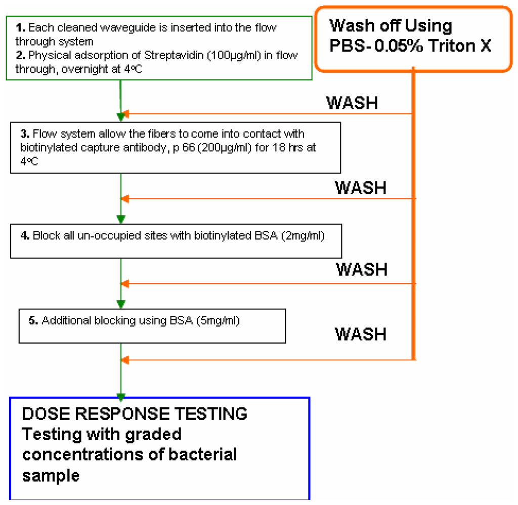 The RAPTOR system uses a disposable coupon that holds four optical fibers (waveguides) which are immobilized with capture antibody. Flow through set up (Fig 1) employed in this study for antibody immobilization on waveguides and subsequent detection for pathogen using a detailed procedure outlined in Fig 2.