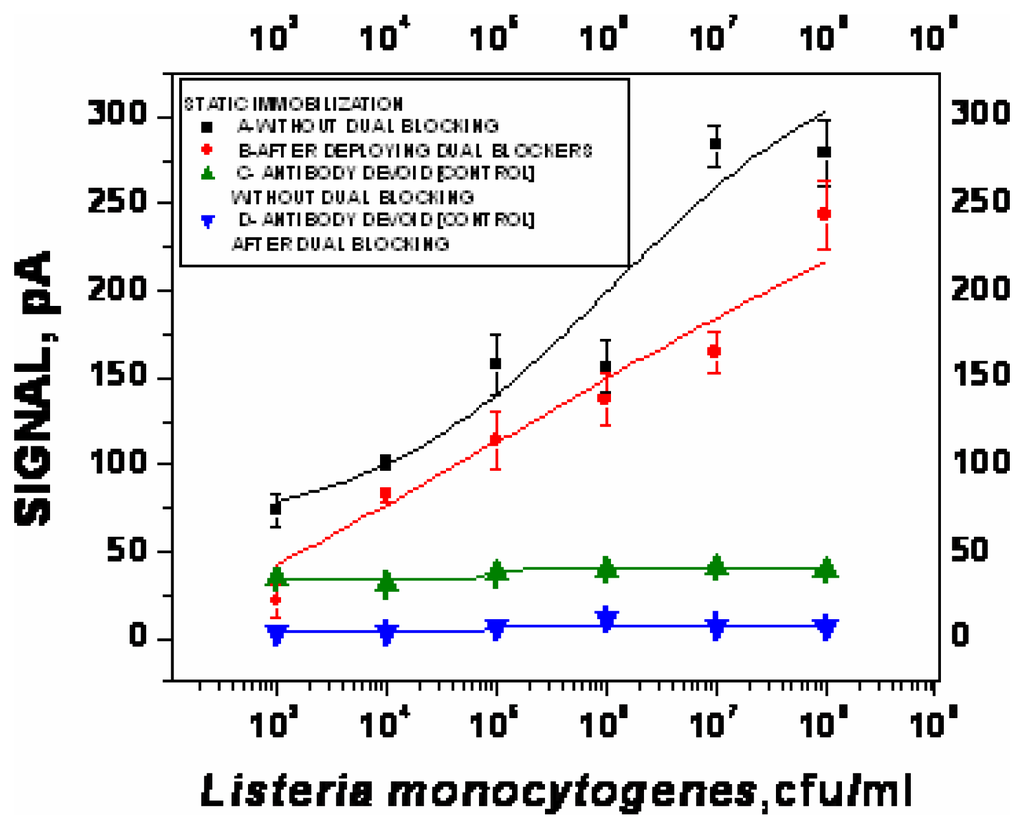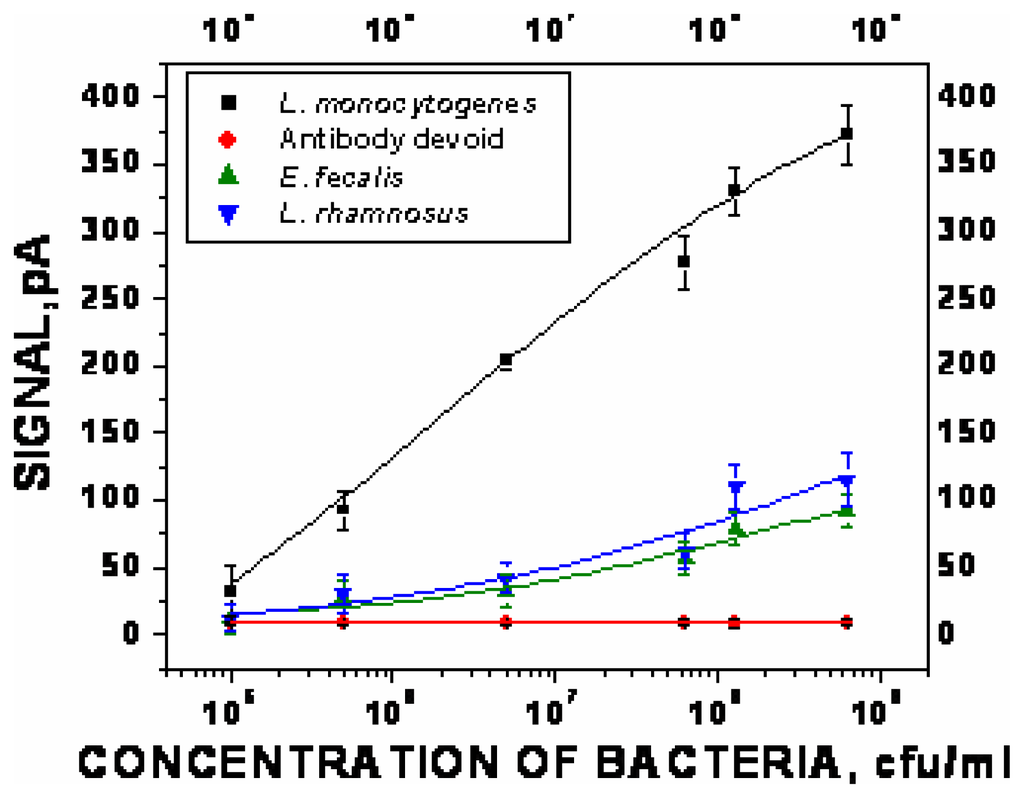For all results, the assay signal in pA was derived after deducting the baseline signal. To calculate the detection limit, four background signals were taken before any samples were tested. The limit of detection was designated as three times the standard deviation of the three negative control signals minus background signal. A change in signal above the last control (PBS) signal for all samples tested was considered a positive result if the change was higher than the limit of detection. The error bars on each graph designate ± standard error (SE). All graphs plotted from mean values which were derived from six individual experimental replicates conducted under identical conditions. All binding measurements obtained were calculated after the intrinsic factors in the antibody-bacteria complex were negated and taking into account the actual count of bacteria from the bacterial samples used in the assay.