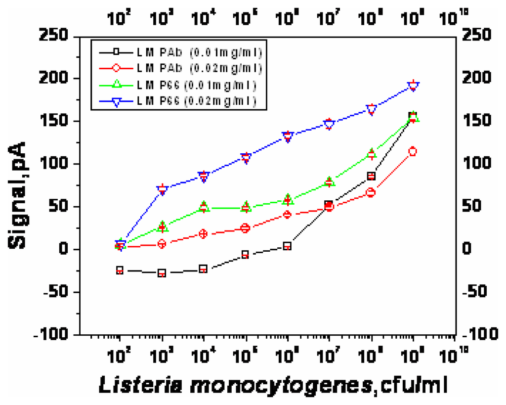 Responses of biosensor for different concentrations of L. monocytogenes by using two different capture antibodies (LM PAb and P66) at lower concentrations. Each datum point represents the mean value obtained from four individual experiments repeated under similar conditions.