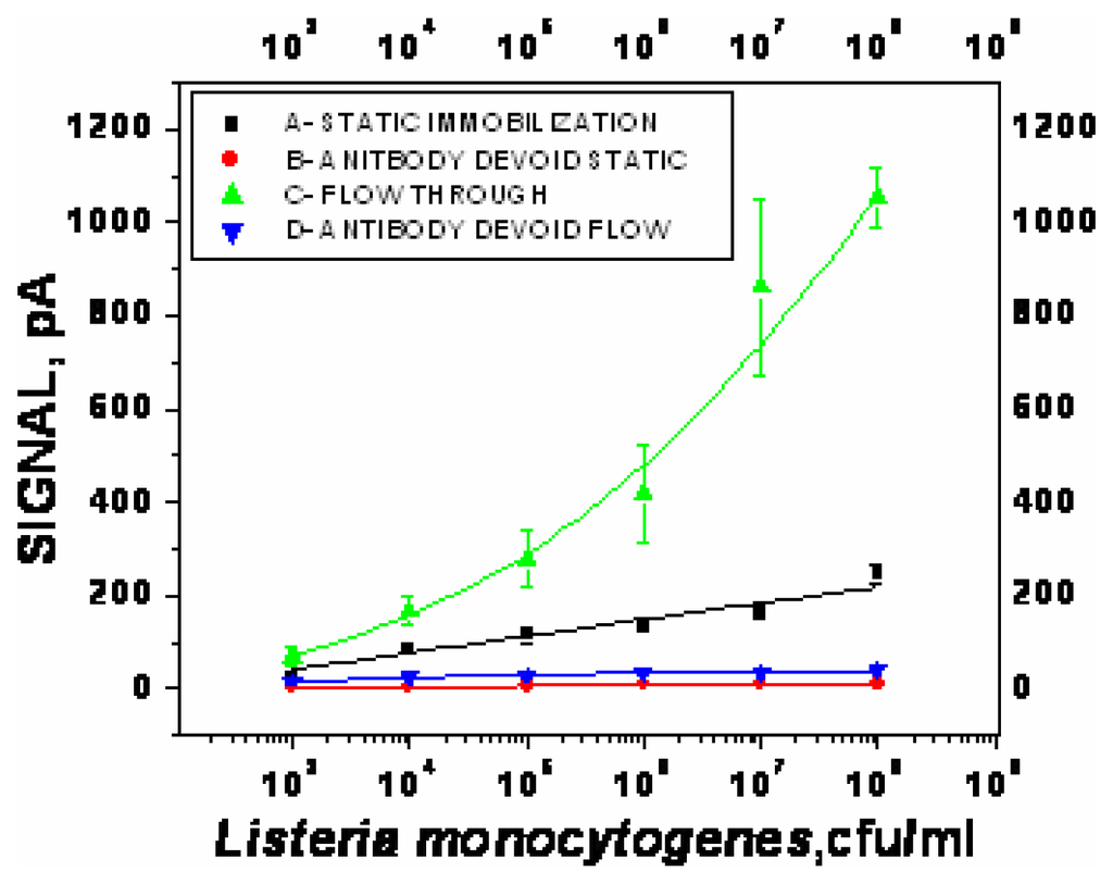 Performance of the biosensor for detection of L. monocytogenes was evaluated with PBS and frankfurter samples spiked with the same. While both the static and flow-through modes of antibody immobilization were compared in tests involving the former, only flow through mode of antibody immobilization was tested with the frankfurter samples.