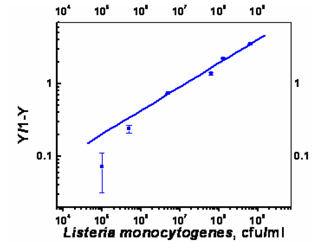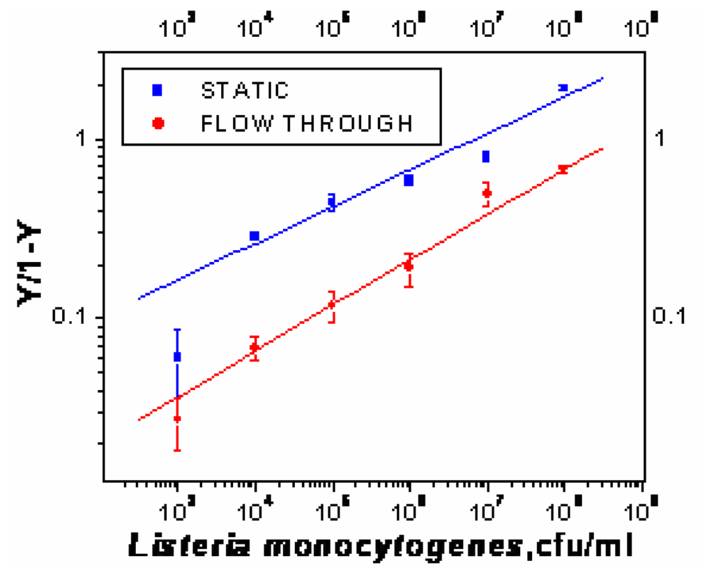 Figure 5 shows the dose responses from PBS containing different concentrations of L. monocytogenes using static and flow through modes of capture antibody immobilization for PAb-P66. The two upper lines representing bacterial binding are sigmoid fits to the mean values obtained from six experimental data, each one derived from individual coupons tested with the same sample (■- χ2=6.02, R2=0.92;