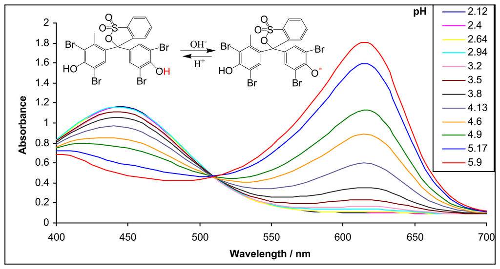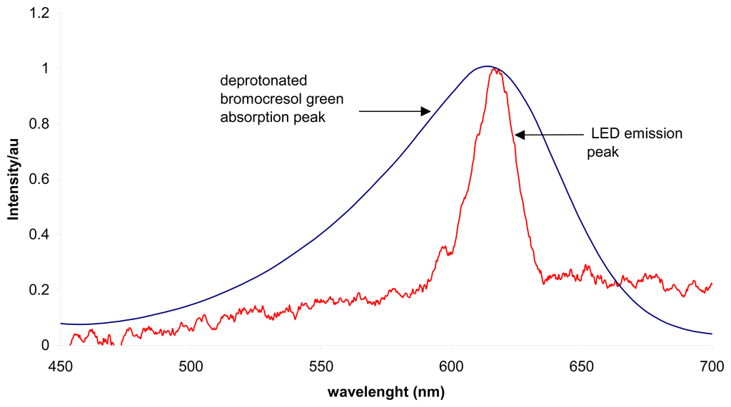 Figure 1 shows the perfect overlapping of the absorption band of the deprotonated pH dye bromocresol green (λmax at 610nm) and the emission band of the LED light source (λmax at 620nm). The acid form of this dye has much lower absorbance than its basic form as shown in Figure 2. This implies that the basic form of the dye absorbs the emission of the LED light source more efficiently and will give optimal sensitivity for this colorimetric measurement. The inset of Figure 2 shows the acid and basic forms of the BCG dye whereas the main feature of the graph is a pH-absorbance plot of the dye obtained by using a conventional bench top UV-VIS instrument. The pKa value of the dye determined with these data was 4.80, which was in agreement with the literature value [20].