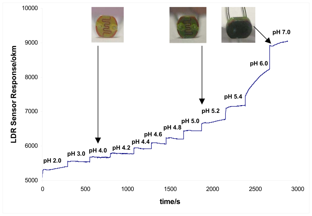 Calibration of LDR sensor with pH buffer solutions resulted in a graph shown in Figure 3. These data were obtained by measuring the solutions in the optical cell with the HP multimeter connecting to a PC. The data logging function was paused during solution change and restarted 5 minutes after the new buffer solution was introduced to allow the sensor to reach equilibrium. Slow diffusion profile observed after pH5.4 was due to the fact that no equilibrium time was allowed for that particular sample due to human error. However, this particular trace showed that the response time (90% of the equilibrium) of the sensor was roughly 5 minutes. The inset in Figure 4 was the actual colour change of the LDR sensor at different pHs, changing from a clear yellow at pH 4 to green at pH 5.2 and dark blue at pH 7.