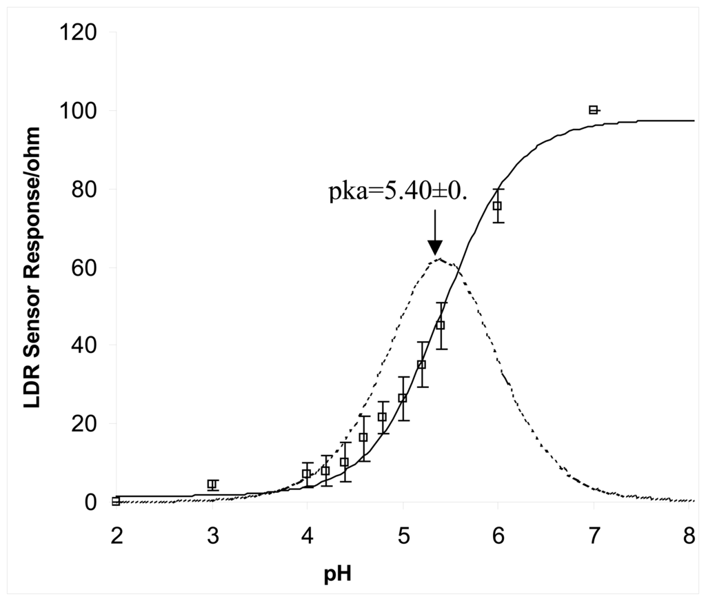Three repeated calibrations obtained from 3 separate days were normalised and presented in Figure 4. As a result, a sigmoidal pH-absorbance plot was obtained as expected for these pH indicator dyes. A best-fit curve was added to the experimental data and from it a first derivative was performed to obtain a pKa value of 5.4±0.05 for the solid-state pH sensor. When pH indicator dyes are immobilised in a membrane, the micro environment of the membrane matrix will normally shift the pKa of the dye up slightly, to sometimes over 0.5 pH unit. The thickness of the membrane also contributes significantly towards the observed pKa value due to a change in dielectric properties of the membrane and the increased diffusion constrain of the ions (protons) concerned. In this example, a higher pKa value was obtained for this LDR sensor, mainly due to the thick sensor membrane that restricted the diffusion of water and ion mobility so that the effective pH in the sensor-solution boundary and the pH within the membrane matrix were slightly different. From the pictures of the LDR sensor shown in Figure 3, it could be seen that strong colour change was observed from the sensor; and from the response profile, it indicated that the membrane thickness could ideally be reduced to achieve better ion diffusion. The relatively high error bars (rsd ≥ 20% for n=3 (days)) shown in Figure 4 were results of dye degradation and conditioning of the sensor, which was kept in buffer solution after each use.