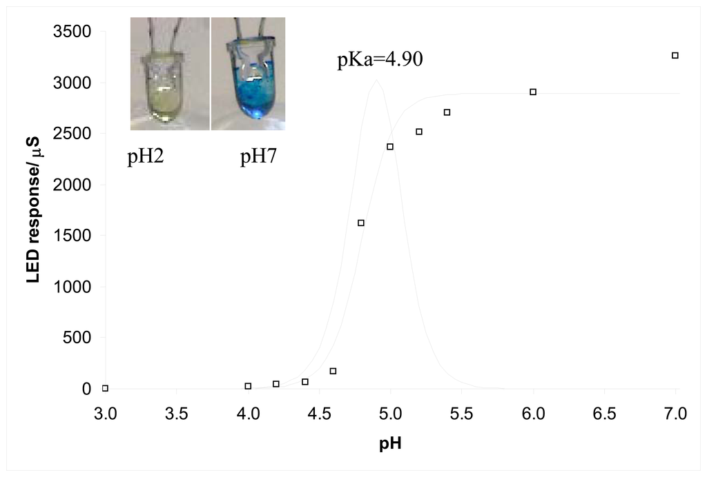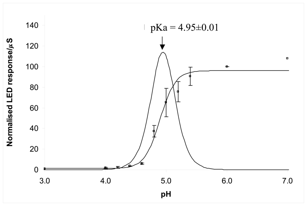 Calibrating the sensor resulted in a plot shown in Figure 5. The insets were two pictures of the LED sensor at pH 2 and pH 7 respectively. The sensor responded to pH change in a similar way to the LDR sensor, resulting in a typical sigmoidal response. An estimated pKa value of 4.90 was obtained with this sensor calibration. A normalised sensor data obtained with three repeats obtained from three separate days is shown in Figure 6 for easier comparison with the data obtained with the LDR sensor. Processing the data as mentioned previously resulted in pKa value of 4.95±0.01, which was very close to the value (4.70) obtained for the free dye in solution phase. These results suggested that the sensor was able to give very accurate individual set of calibrations. However, significant day to day sensor drift were observed as evidenced by the high rsd values of ∼20% for n=3 (days). This drift was not due to dye leaching as no detectable dye was present in the storage solution. Reductive degradation of the dye, which is a known phenomenon, combined with polymer membrane conditioning are therefore believed to be the main reasons for the error. This implies that the sensor has to be calibrated before use for optimal accuracy.