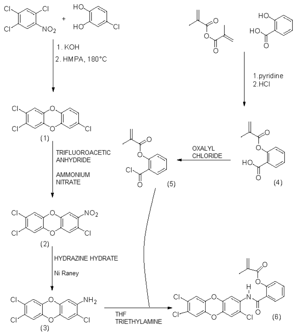 N-(2-(3,7,8-trichlorodibenzodioxinyl))-2-methacryloyloxybenzamide (6) for MIP1: details on all steps can be found in ref.1. The synthetic scheme of template (compound (3)) for MIP2 consists of only steps for products (1) to (4) in