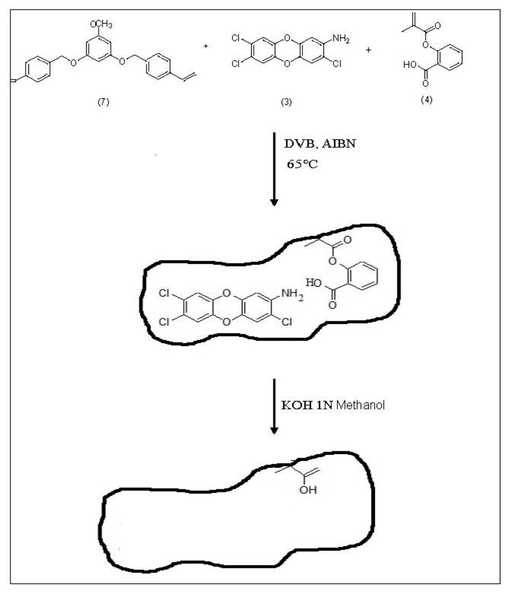 N-(2-(3,7,8-trichlorodibenzodioxinyl))-2-methacryloyloxybenzamide (6), fused with a salicylic acid moiety ensures the introduction of methacrylic acid residue into polymer after hydrolysis for template removal (