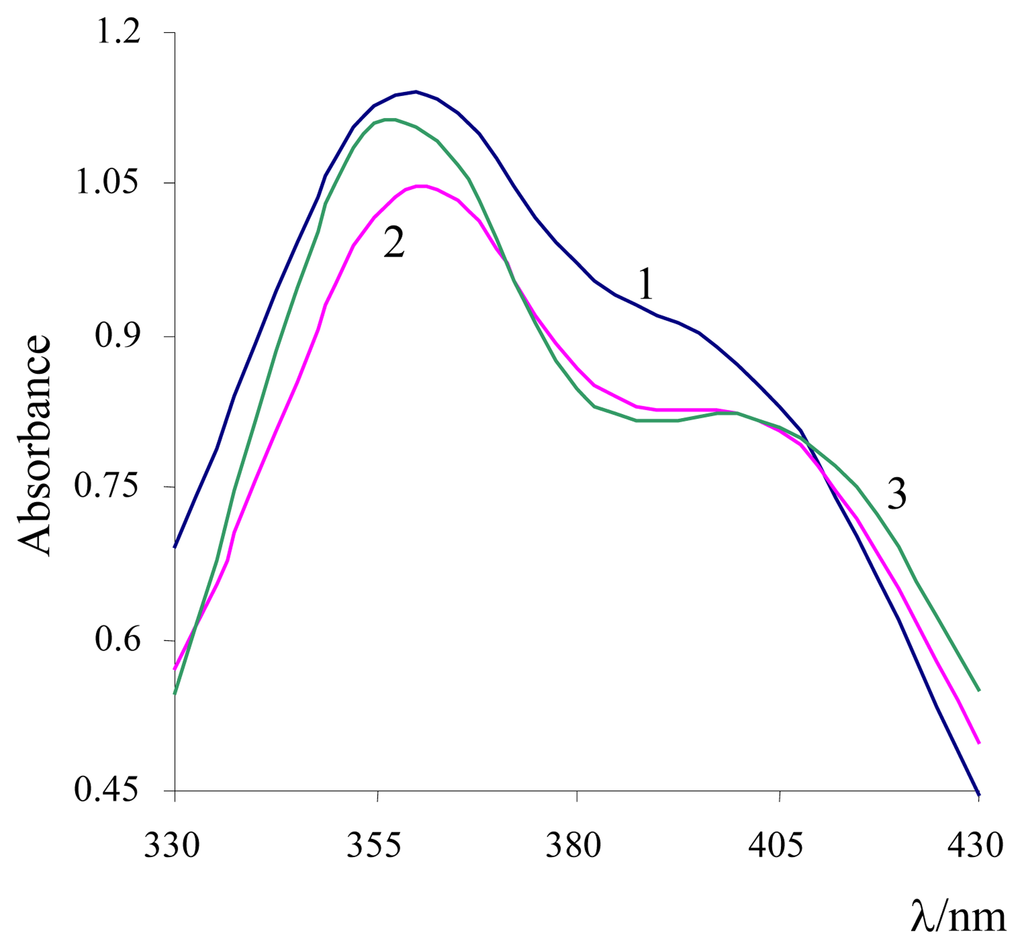 Absorption spectra of R– species of α-DNP (7.38×10–5 M) in water (1), in 2.5×10–3 M calix[4]arene solution (2), and in CTAB micellar solution (3); pH = 6.5–12.