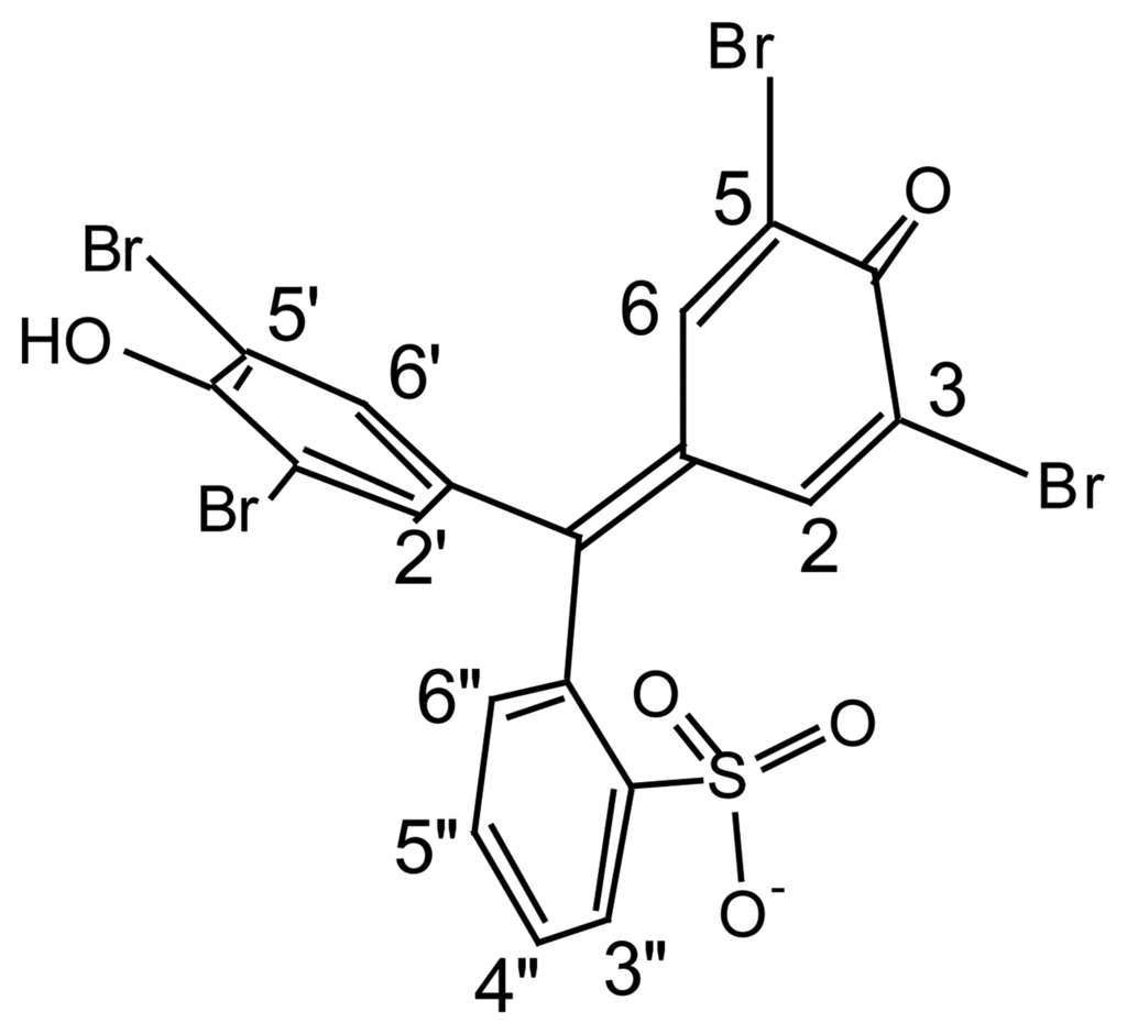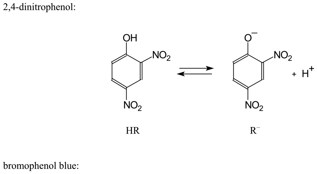 First, the relatively small–sized indicator molecules are represented here by 2,4-dinitrophenol (α-DNP) (Chart 2). Second, the standard acid–base sulfonephthalein indicator, bromophenol blue (BPB) (Chart 2), is certainly too large to be involved to high extent into the host cavity.