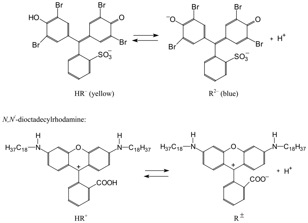 where A is the absorbance at the current pH at chosen wavelength and constant dye concentration, ARz−1 and AHRz are absorbances under conditions of complete transformation of the dye into the correspondent form (Rz–1, HRz). Here z and (z–1) are charges of the conjugated indicator species (HRZ ⇄ Rz−1 + H+). The ratio of the equilibrium concentrations of these species can be derived from electronic absorption, while the pH values of the bulk (continuous, aqueous) phase are determined as a rule by using the glass electrode.