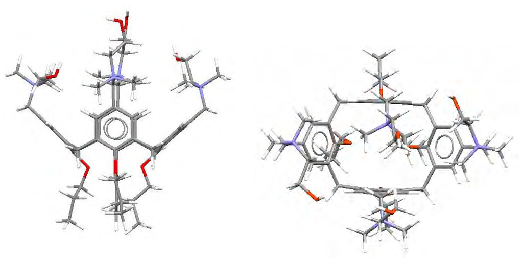 Spatial structure of calix[4]arene was investigated with molecular mechanic computations (MM+). Calixarene exists in a pinched cone conformation (Chart 4, chlorine anions are omitted for clarity).