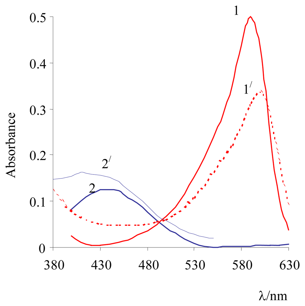 Absorption spectra of BPB species: R2–, pH = 6 (1, 1′) and HR–, pH = 0–1.0 (2, 2′) (5.0×10–6 M) in water (1, 2) and in 5×10–3 M calix[4]arene solutions (1′, 2′).