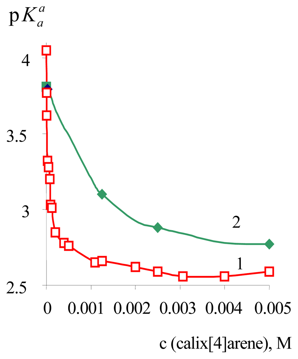 values on calix[4]arene concentration in aqueous media, at ionic strength 0.05 M (NaCl): BPB (1); α-DNP (2).