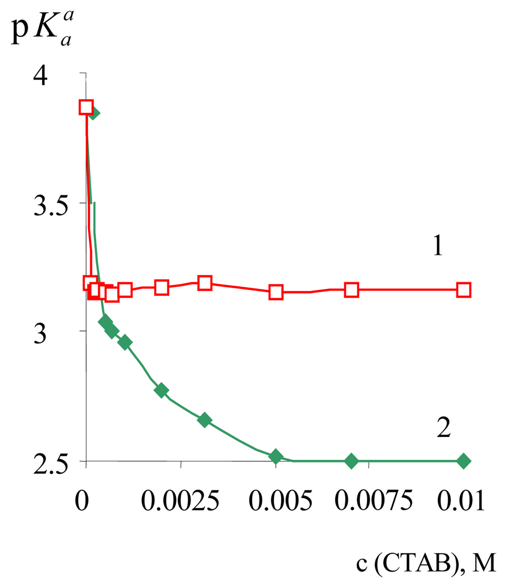On the other hand, the formation of aggregates (self–assembled associates, clusters), or micelles, consisting of several calixarene molecules (ions) cannot be excluded [,]. Furthermore, alterations of the absorption and emission spectra of the dyes can evidently result not only from interaction with the molecular cavity, but also from dye adsorption on the surface of the aforementioned aggregates. From this viewpoint, the changes in the protolytic properties of the dyes, caused by water–soluble calixarenes, seem to be a source of additional information.