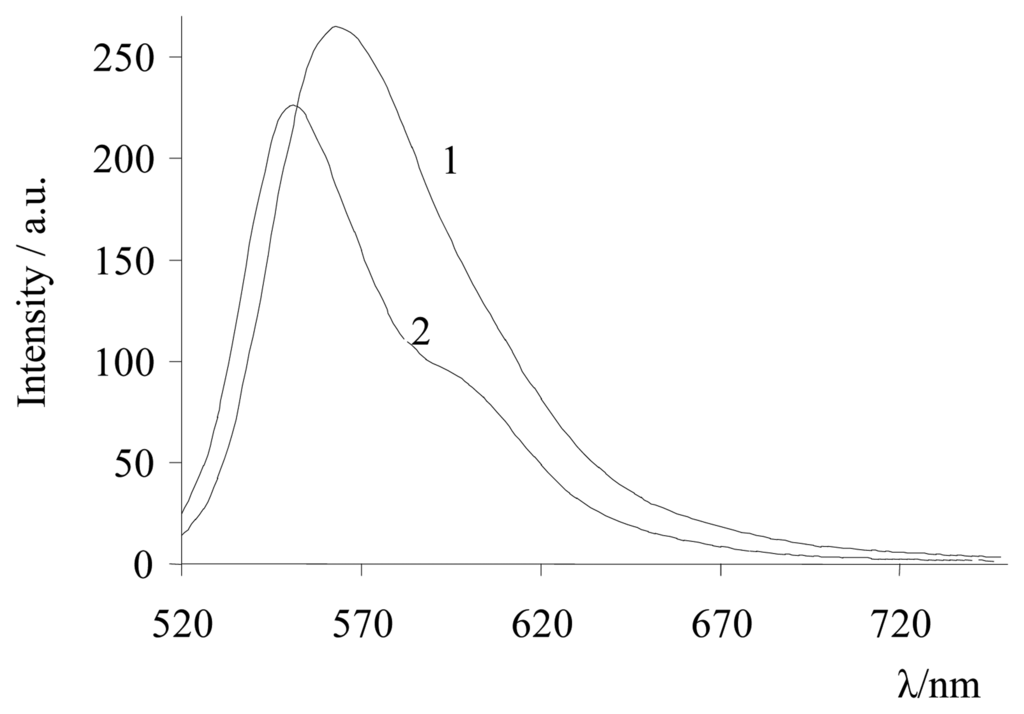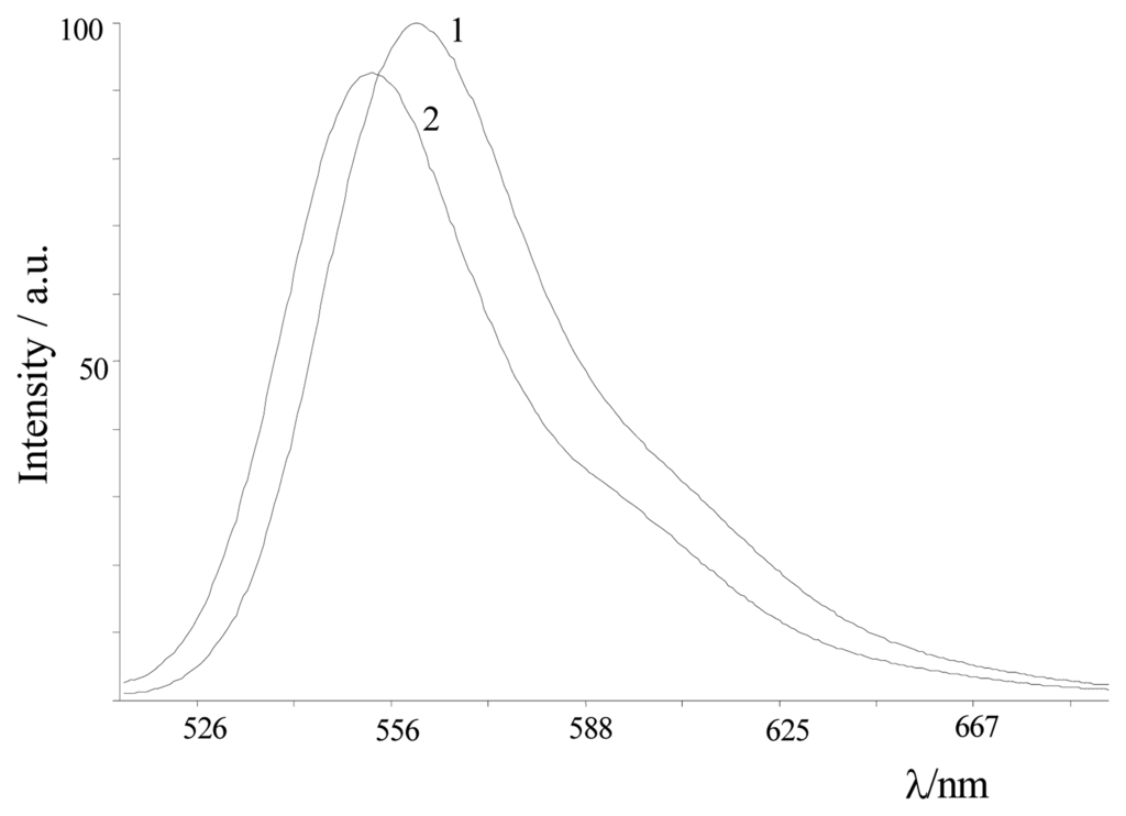 Emission spectra of DODR in aqueous solutions of calix[4]arene (2.5×10–3 M): HR+, pH = 1.2 (1) and R±, pH = 6 (2).