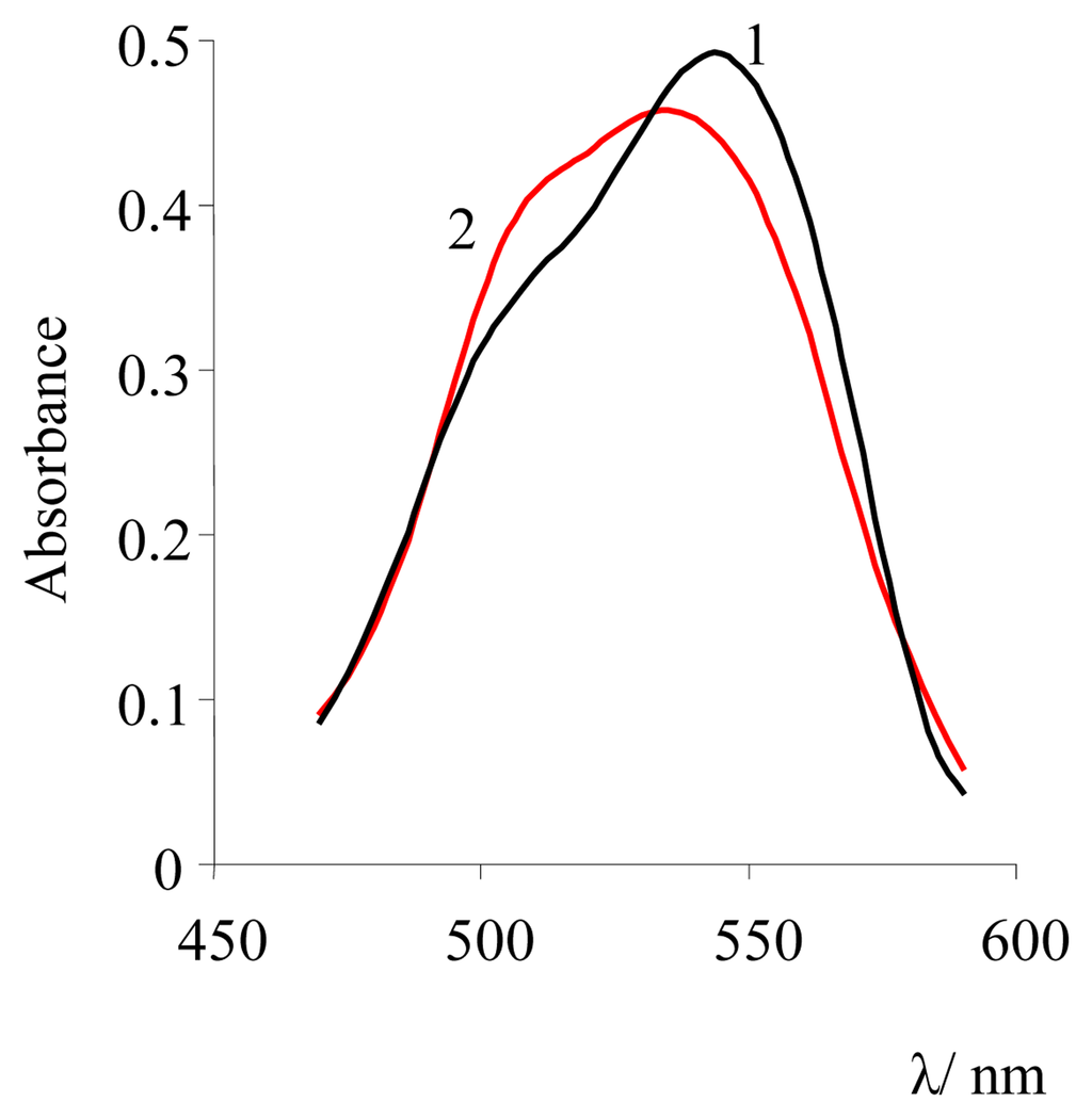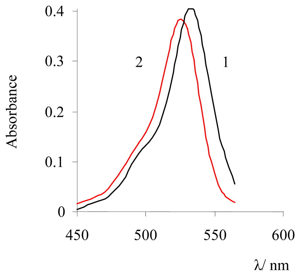 Absorption spectra of DODR species in aqueous CTAB solutions (0.01 M): HR+, pH = 0–0.5, (1) and R±, pH = 9.2 (2).