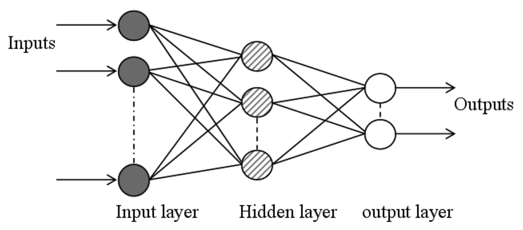 One of the most widely used artificial neural networks is back propagation artificial neural network (BPNN), which is also called feed forward network. It comprises many processing elements, i.e. nodes, which are arranged in layers: an input layer, an output layer, and one or more layers in between, called hidden layers. A schematic diagram of BPNN with one hidden layer is shown in Fig. 1.