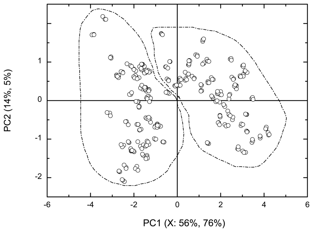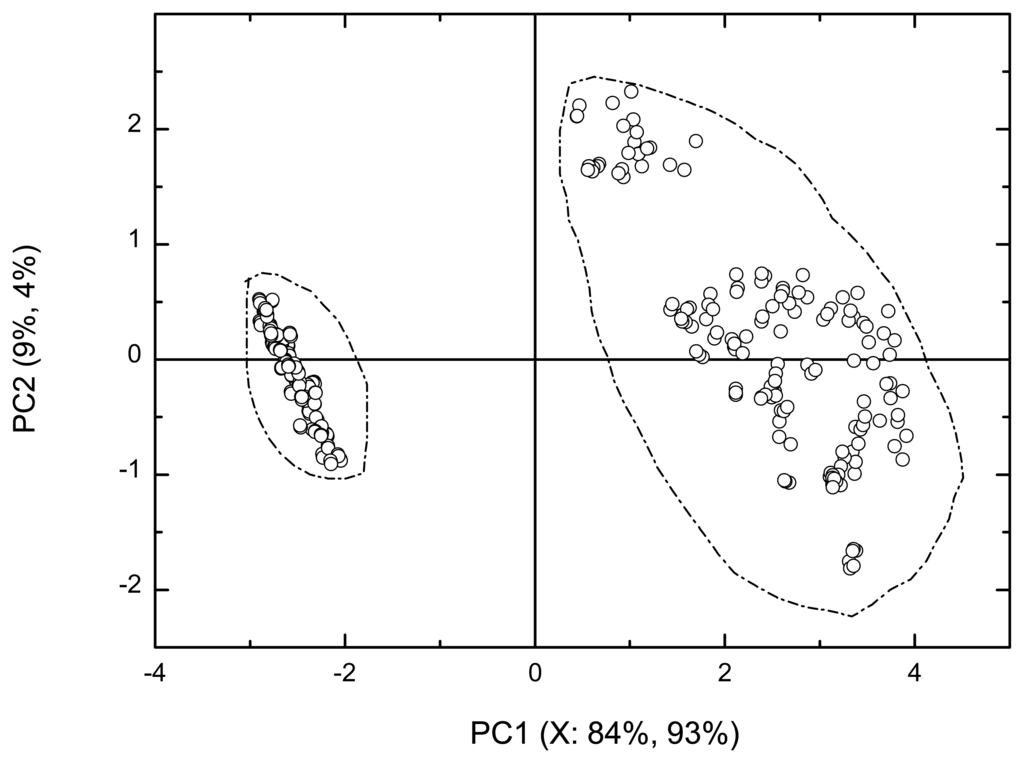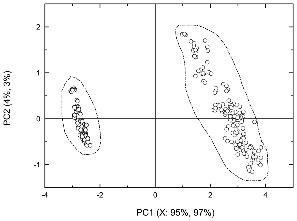 BPNN classification models were superior to linear classification methods, e.g. partial least square – discriminant analysis (PLS-DA) [11]. This was explained by the non-linear response of electrodes [25], which results from interferences between ions in the test mixtures [26]. However, PLS-DA showed a complete agreement with BPNN in some cases. PLS-DA was carried out for classification of the last three test mixtures of key odorants shown in Table 3. In these cases, the two test mixtures were easily separated in the PLS score plots, as shown in Fig. 3, 4 and Fig. 5. Electrodes no. 1, 2, 5, 6, 7, 8, 9, 11 were sufficient.