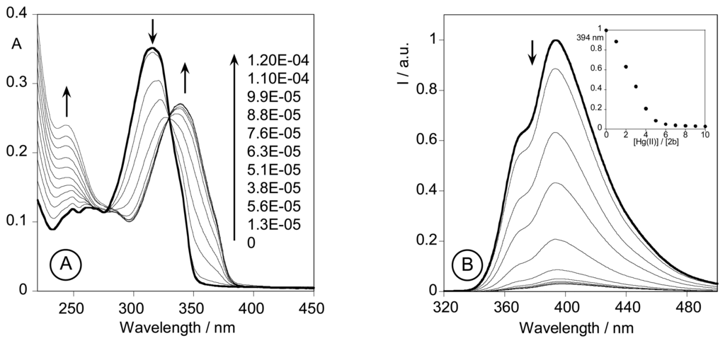 In Figure 1 is represented the absorption (A) and emission (B) spectra of compound 2b in the presence of increasing amount of Hg(II). The increase of Hg(II) ion concentration in absolute ethanol solution caused the decrease in the absorbance in the range of 280-340 nm, and increase in absorption between 340-390 nm. A sharp isosbestic point at λ= 330 nm was detected (Fig. 1A). After the addition of small molar ratio equivalents of metal ions (0.25 to 1 equivalent) a small effect in absorption and emission was observed. By increasing the metal-ligand molar ratio, strong changes in absorption and emission were observed (inset Figure 1B).