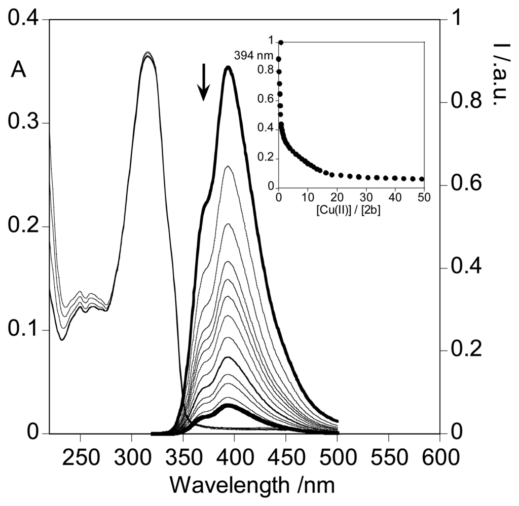 Spectrophotometric titration and fluorimetric titration of an ethanolic solution of 2b with a standard solution of Cu(CF3SO2)2 in absolute ethanol. ([2b] = 1.30E-5 M, T = 298 K, λexc = 316 nm. Inset: normalized emission at 394 nm).
