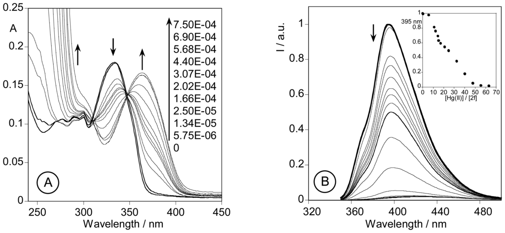 Spectrophotometric titration (A) and fluorimetric titration (B) of an ethanolic solution of 2f with a standard solution of Hg(CF3SO2)2 in absolute ethanol. ([2f] = 1.00E-5 M, T = 298 K, λexc = 334 nm. Inset: normalized emission at 395 nm).
