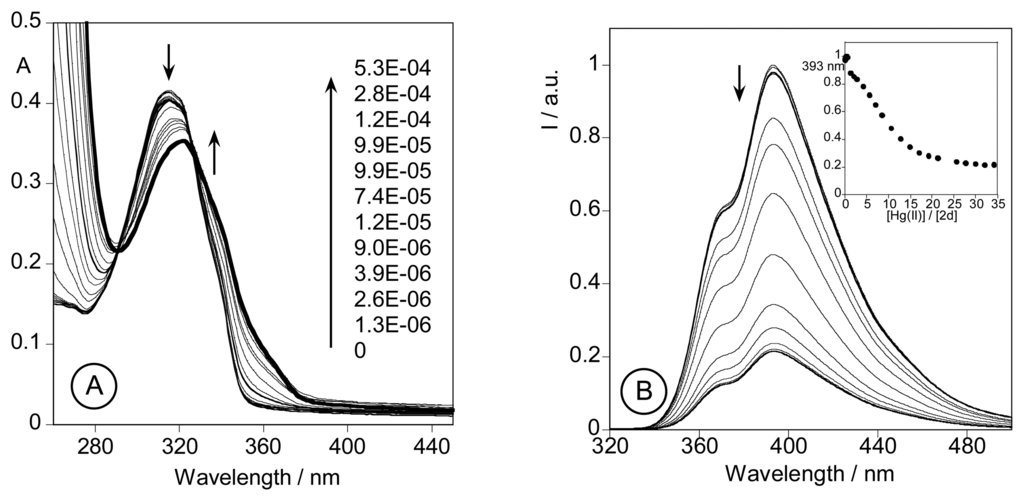 Spectrophotometric titration (A) and fluorimetric titration (B) of an ethanolic solution of 2d with a standard solution of Hg(CF3SO2)2 in absolute ethanol. ([2d] = 1.00E-5 M, T = 298 K, λexc = 315 nm. Inset: normalized emission at 393 nm).