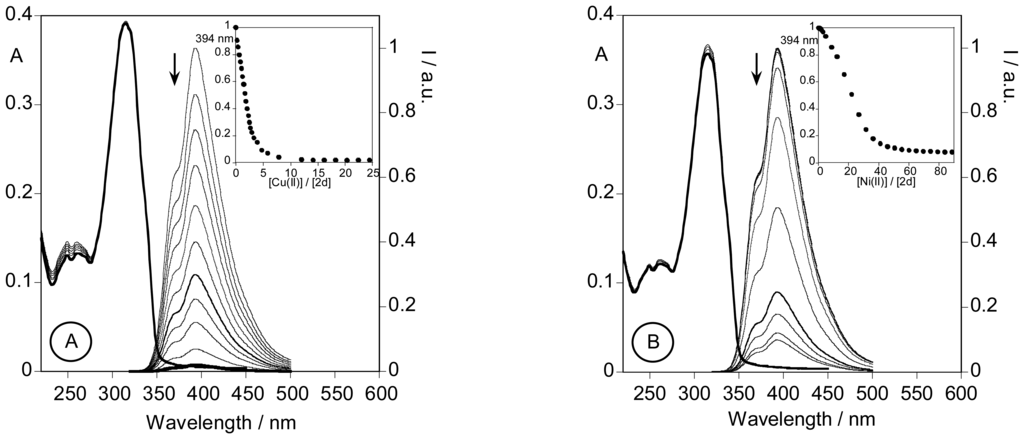 Spectrophotometric titration and fluorimetric titration of an ethanolic solution of 2d with a standard solution of Cu(CF3SO2)2 (A) and Ni(BF4)2 (B) in absolute ethanol. ([2d] = 1.80E-5 M, T = 298 K, λexc = 315 nm. Insets: normalized emission at 394 nm in both cases).