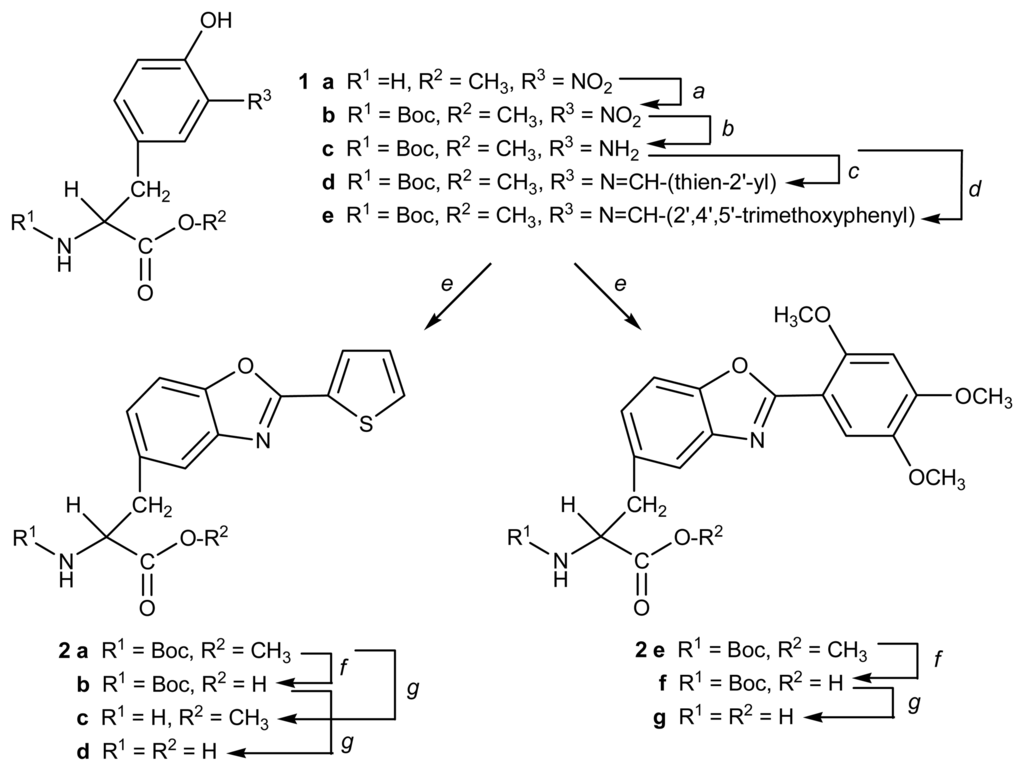Starting from commercially available 3-nitro-l-tyrosine, reaction with thionyl chloride in methanol yielded the corresponding methyl ester 1a. Subsequent reaction with t-butyl pyrocarbonate resulted in the N-Boc protected derivative 1b. The nitro group in this compound was reduced to the amino group, by catalytic hydrogenation, yielding compound 1c [25], which was condensed with 2-formylthiophene, in order to obtain the imino derivative 1d. By reaction with lead tetraacetate (LTA) in DMSO [26], compound 1d was oxidised to the [2-(2′-thienyl)benzoxazol-5-yl] alanine derivative 2a.