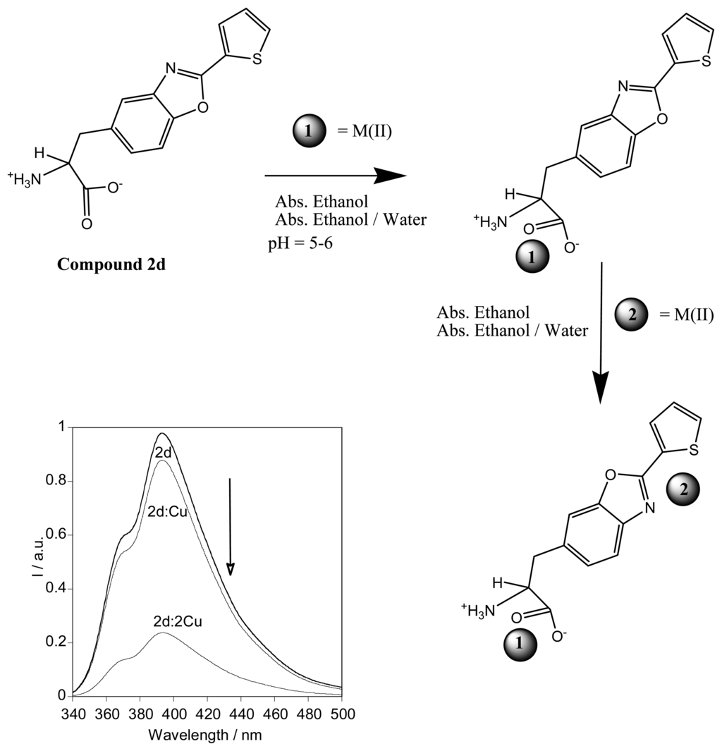 Schematic representation of the complexation mechanism proposed for alanine 2d upon complexation with Cu(II), Ni(II) and Hg(II). Fluorescence spectra of 2d in the presence of one and two equivalents of Cu(II) in absolute ethanol.