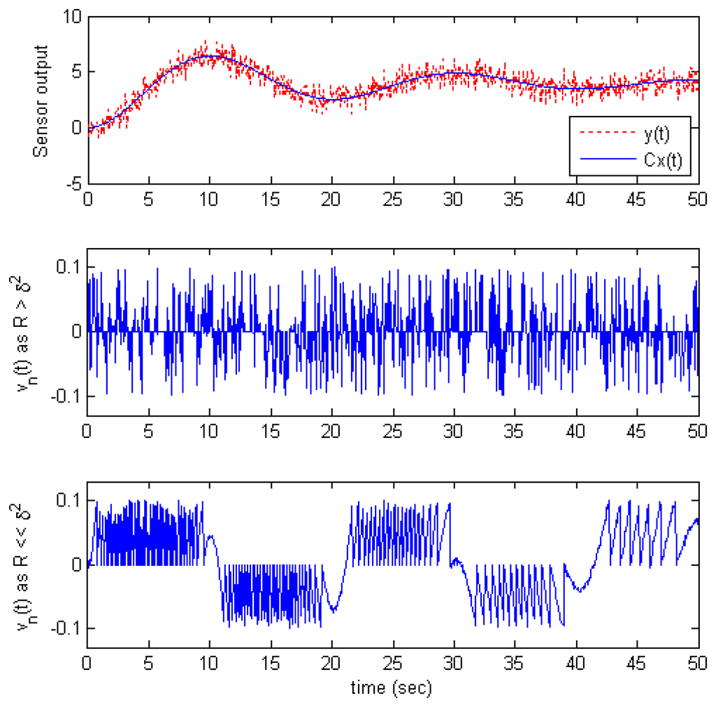 To demonstrate this argument, consider an example of the output response of an 2nd order system with step input shown in Figure 2. The top graph is the output signal without noise Cx(t) and the measurement output y(t). In this example, y(t) is sampled by the send-on-delta scheme with δ = 0.1. The new measurement noise vn(t) is shown in the middle and bottom graphs for two cases: R > δ2 and R ≪ δ2, respectively. Obviously, the waveform of vn(t) is rather different in two cases: It is a uniform distribution with zero mean in the first case, but with non zero mean in the second case. For example, vn(t) has a positive mean value in time range (0,10s) but a negative mean value in (10,20s).