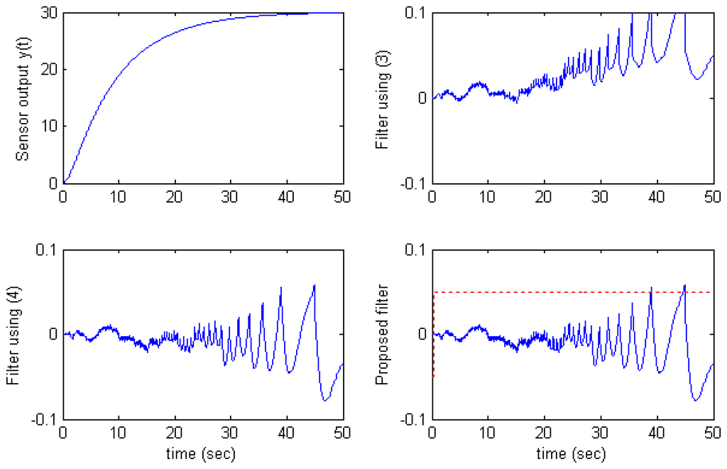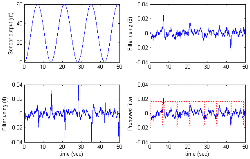 The εi thresholds determine when the filter uses (4) instead of (3). The smaller εi is, the more the filter relies on (4). In practical systems, εi thresholds could be determined by monitoring derivative of the sensor output