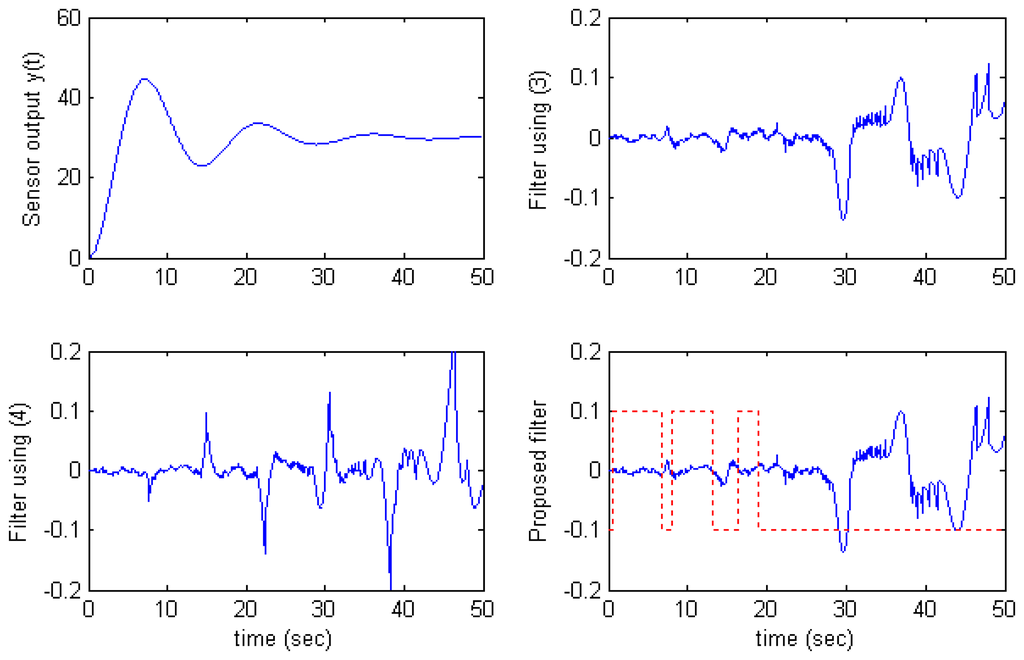 The proposed filter overcomes this situation by applying the algorithm (7) in which the filter uses (3) at time y′(t) changes sign and uses (4) at other time. The solid line on the proposed filter graphs in Fig.4, Fig.5, and Fig.6 presents the sign of Selector (7). That is, Selector > 0 denotes that the filter uses (4) and Selector < 0 denotes that the filter uses (3).