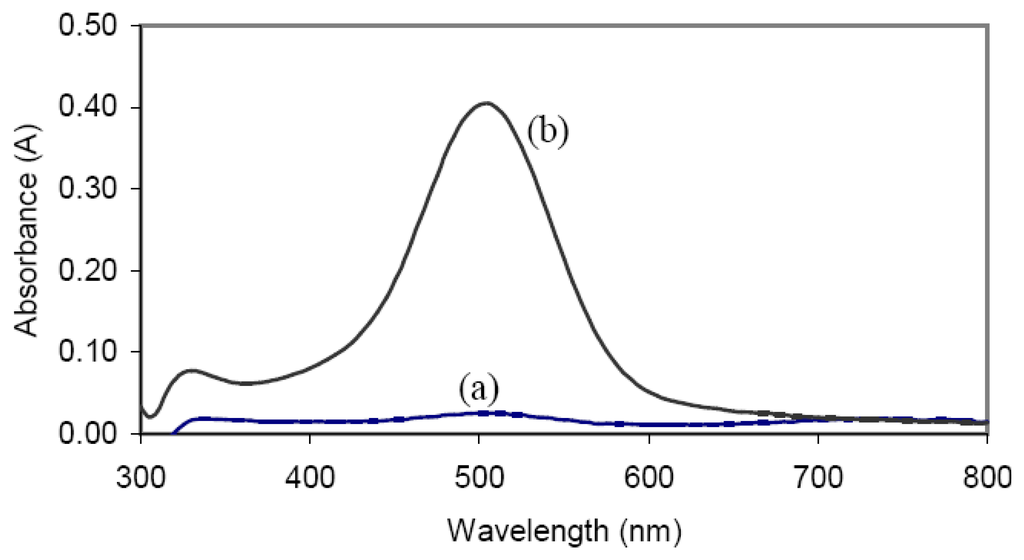 The absorption spectra of the biosensor based on immobilization of MBTH in stacked films containing hybrid nafion/sol-gel silicate and laccase in chitosan film is illustrated in Figure 2. In the presence of catechol, a maximum response of the biosensor was obtained at wavelength of 505 nm and this is similar to our previous observation where tyrosinase and HRP were immobilized using the procedure for the determination of phenolic compounds [,].