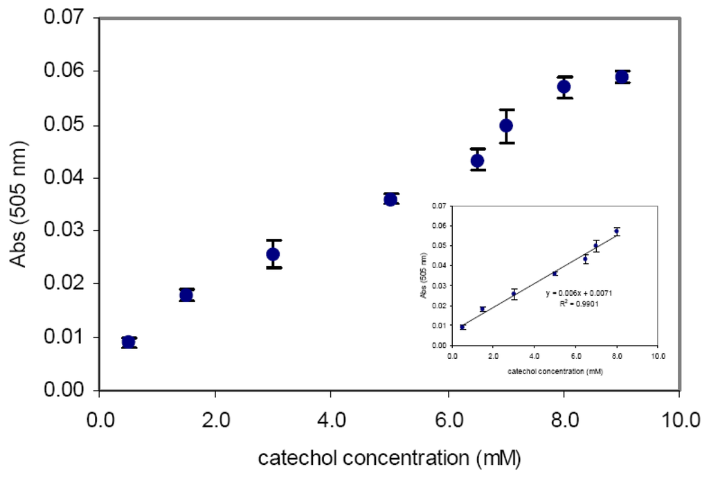 The analytical characteristics of the laccase biosensor were studied using four different types of phenolic compounds such as catechol, guaiacol, o-cresol and m-cresol. The biosensor response only to catechol but did not show any response towards guaicol, o-cresol and m-cresol, respectively. This is in contrast to observation that free laccase in solution can react with guaiacol, o-cresol and m-cresol. The non-reactive of laccase to other phenolic compounds except for catechol may due to the hydrophobic hybrid nafion/sol-gel silicate film used in enzyme immobilization have restricted the interaction of the enzyme with certain phenolic compounds []. Another possible reason for such observation is the changes in the stability of the phenoxy radical produced in the enzyme reaction and the steric hindrance between the phenolic compounds and the enzyme active site []. Figure 10 shows the dynamic range of the biosensor towards different catechol concentrations and linearity was obtained in the range of 0.5-8.0 mM catechol with detection limit of 0.33 mM. The detection limit was calculated based on the method reported by Day and Underwood [] and Navas Diaz et al. [].