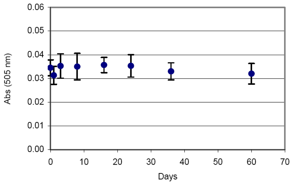 The long-term stability of the optical biosensor based on immobilized laccase in chitosan film.