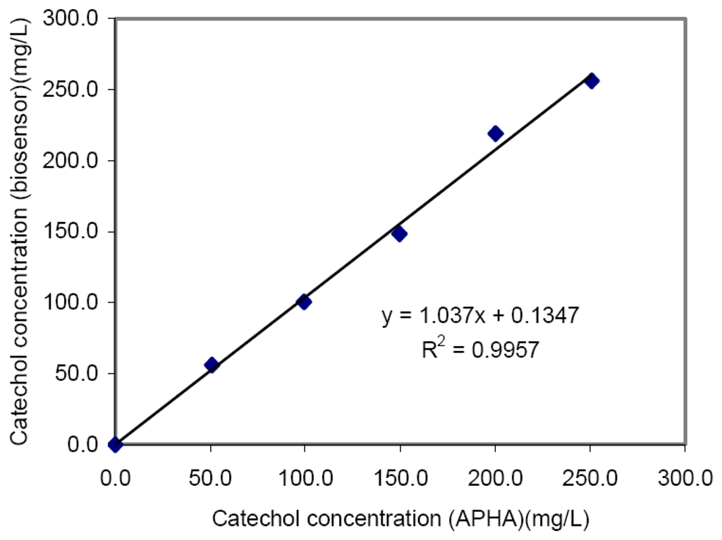 The reproducibility of the biosensor was investigated at catechol concentration of 6.5 mM. A relative standard deviation (RSD) of 5.6 % (n = 8) was achieved. The biosensor exhibited good storage stability for at least two months when stored dry at 4 deg;C (Figure 11) and almost 90-98% of their initial activity was retained after two months of storage at 4 deg;C. A laccase biosensor based on immobilization of enzyme on glassy carbon electrode modified with redox carboxylic group also demonstrated similar shelf-life []. Figure 12 shows the analytical performance of the optical biosensor compared with an established method, APHA [] for catechol concentration range of 0.0–250.0 mg/L. A good correlation was obtained between these two methods (r = 0.9957, slope = 1.037).