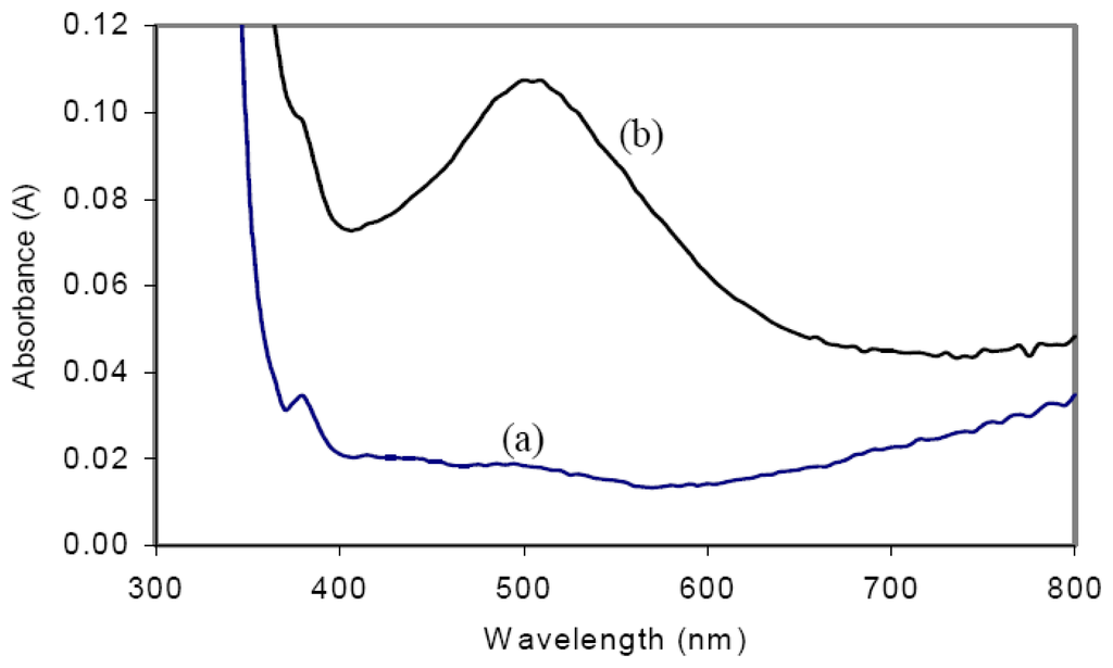 All absorption measurements were conducted by using an ultraviolet-visible spectrophotometer (model Varian-Cary win UV 50). The biosensor was immersed in 3 mL of 50 mM phosphate buffer solution of pH 6.0 for 5 min and then washed with distilled water. It was then placed in a plastic cuvette containing 6.5 mM catechol in 3 mL of 50 mM phosphate buffer solution pH 6.0. The absorption spectra were recorded in the wavelength range of 300-800 nm at an interval of 1 min for 10 min. The response of the biosensor was studied at a fixed wavelength of 505 nm established from the spectra obtained earlier.