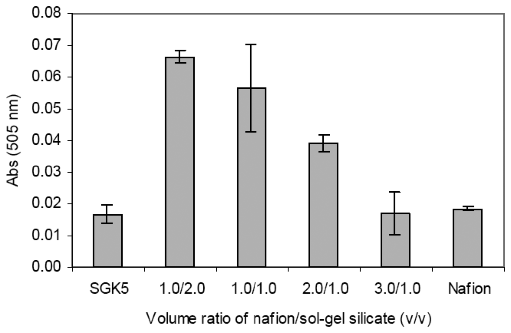 A homogeneous stock sol-gel solution was prepared by vigorously mixing 1000 µL of TEOS, 200 µL of distilled water and 10 µL of 0.1M HCl in a glass vial. The sol-gel solution was stirred for 24 hours. Then nafion solution was mixed homogeneously with the sol-gel silicate solution at volume ratio of 1: 2, 1:1, 2:1 and 3:1 (v/v) and kept at room temperature for overnight. A small portion of 100 mM MBTH solution was mixed to hybrid nafion/sol-gel silicate mixture, nafion solution and sol-gel silicate solution at volume ratio of 1 to 3 (v/v) and the mixture was stirred until homogeneous solution was obtained.