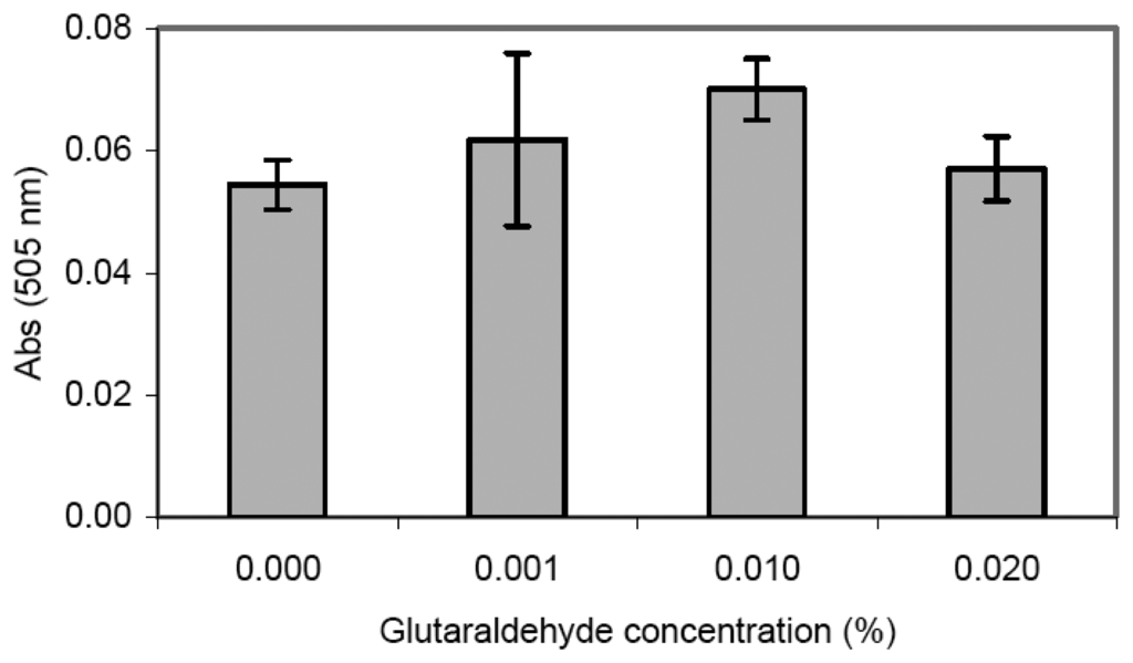 Glutaraldehyde is commonly used as a cross-linking agent for protein immobilization in biosensor [,]. In this study, glutaraldehyde in the concentration range of 0.0-0.02 % was employed as a cross-linking agent for laccase immobilization in chitosan. The response of the biosensor increases as the glutaraldehyde concentration was increased until optimum value of 0.01 % (Figure 5). At glutaraldehyde concentration greater than 0.01 %, the sensor response decreased, which may be attributed to excessive cross-linking between the immobilization materials where the active sites of the enzyme were blocked and thus a decrease in the activity of the immobilized enzyme [,].