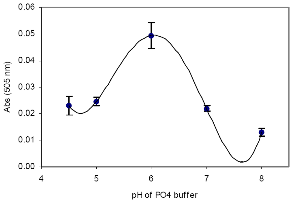 The pH of the working buffer was also investigated using 50 mM phosphate buffer covering the pH range of 4.5-8.0 (Figure 6). The optimum response of the biosensor was obtained at pH 6, which is also the optimum pH for the enzyme. Thus the immobilization of the enzyme laccase did not alter its optimum pH for catalytic activity [,]. This finding is in agreement with the work reported for immobilized laccase on carbon fibre electrode [], graphite electrode [], redox hydrogel polymer [] and platinum treated silane []. In these studies, the optimum response was in the pH range 4.5-6.0. Therefore, pH 6.0 was chosen in subsequent experiments.