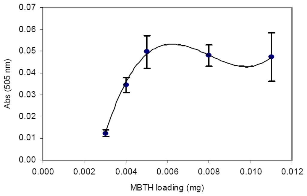 The effect of MBTH loading on the biosensor response was investigated by measuring the absorbance at a fixed wavelength of 505 nm. It was found that the intensity of azo-dye products attained constant values when the amount of MBTH was 0.054 mg (Figure 7) and this quantity was used in the preparation of nafion/sol-gel silicate-MBTH films.